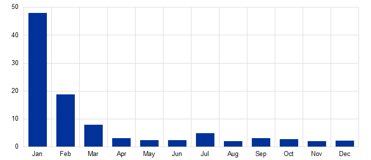 The price changes in around a quarter of all services items are concentrated in one or two months of the year. Repricing can happen at different times in different countries, which means that finding a clear repricing pattern for the euro area aggregate is not a straightforward process. Our approach is based on the 39 euro area services items in the 4-digit Classification of Individual Consumption by Purpose (COICOP-4) over the period from 2016 to 2024. For each item, the following selection approach is applied. First, we calculate the month-on-month percentage price change for each calendar month, using non-seasonally adjusted price indices. Second, we calculate the average change for each calendar month over all the years in the period. Third, we calculate the relative importance, as a percentage share, of each month with respect to the total price change for the whole year. For the second and third steps, we use absolute values because these allow us to assess the relative magnitude of all price changes, independently of the direction of the change. For example, the share for January is the average of the monthly absolute price changes in the month of January for all years between 2016 and 2024 divided by the sum of the averages of all monthly absolute price changes over the same period. Fourth, we identify the calendar months where either (i) the percentage share of a price change in any single month is above 25%, or (ii) the combined share of any two months with the highest shares is above 35% of the total change over the sample period. Finally, a services item is assigned to the “annual repricing” category if it fulfils these criteria and the month-on-month price change for the identified calendar months is positive on average between 2016 and 2024.[3] The thresholds are based on judgement but are relatively high in assuming that, at a minimum, between one-quarter and one-third of the change in a price index takes place in only one or two months of a year. For example, the results show that 48% of the total absolute price change for hospital services over the period occurred in the month of January in each year (Chart C).[4] The approach identifies 16 services items – around 25% of total services (based on 2025 weights) – as having an annual repricing pattern. Around one-half of the items that are repriced annually fall into the administered prices category.