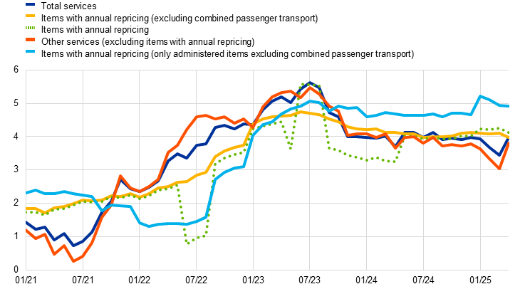 Items that show an annual repricing pattern have played an increasing role in keeping services inflation elevated. During the latest inflation surge, the inflation rates of items without an annual repricing pattern rose earlier and more sharply than those of items with an annual repricing pattern, especially for administered items (Chart D). As the upward cost shocks started to unwind, inflation for items with non-annual repricing declined more noticeably, while the inflation rate of services items with annual repricing (excluding combined passenger transport) hovered at slightly above 4.0% in the second half of 2023 and in 2024. The inflation rate of items with a repricing pattern has been slightly above the rate of services without annual repricing since the end of 2023. This is mainly a result of the particularly high inflation rate of administered items within the annual repricing group.