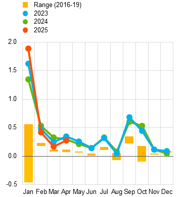 (percentages of the price change in each month relative to the change over the whole year, on average over the 2016-24 sample period)