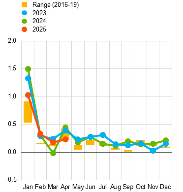 Notes: “2017-19” refers to the average of the monthly rates of change over this period. The latest observations are for April 2025.