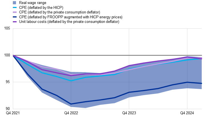 Notes: CPE stands for compensation per employee. Panel a): sectoral value-added deflators are used to calculate real producer wages. For the total economy, the value-added deflator used corresponds to the GDP deflator. Panel b): the shaded area refers to the cross-country inter-quartile range for the respective indicators. The latest observations are for the first quarter of 2025.