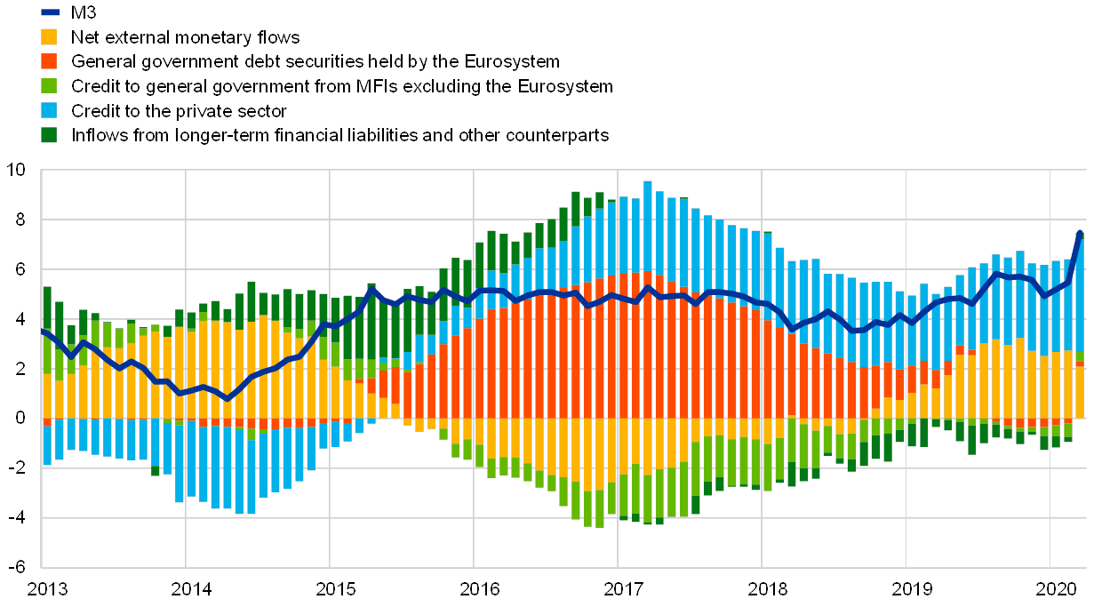 In March 2020 credit to the private sector remained the main source of money growth, followed by external monetary flows. Credit to the private sector, which has long been the main driver of M3 growth (see the blue portion of the bars in Chart 11), was behind the strong increase in M3 growth in March 2020. External monetary flows have been the second main source of money creation since October 2018 (see the yellow portion of the bars in Chart 11). These inflows reflect the interest of foreign investors in euro area assets (in particular newly issued government securities), and have provided a significant contribution to M3 since the beginning of 2019. The ECB’s net asset purchases under the pandemic emergency purchase programme (PEPP), which was launched on 18 March 2020, together with the increased purchases under its asset purchase programme (APP), made a positive contribution to M3 growth (see the red portion of the bars in Chart 11). Furthermore, the contribution of longer-term financial liabilities remained small in March 2020 (see the dark green portion of the bars in Chart 11).