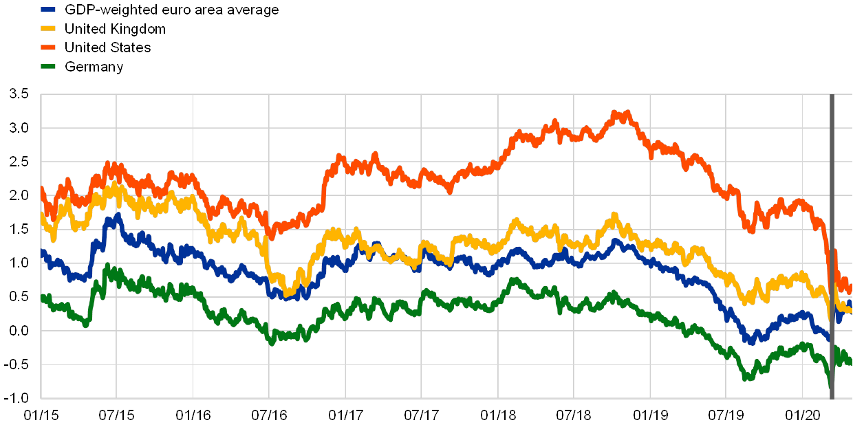Long-term sovereign yields in the euro area increased over the review period amid some volatility in the wake of the spread of COVID-19 and the lockdown of numerous economies. Over the review period (12 March 2020 to 29 April 2020), the GDP-weighted euro area ten-year sovereign bond yield increased overall by 14 basis points to 0.25% (see Chart 3), more or less mirroring the increase in the ten-year overnight index swap (OIS) rate. There was some volatility, however, with markets reacting to news of the virus’ spread and related lockdowns by sharply increasing the yields of most euro area issuers. Following the announcement of accommodative economic policy measures (both monetary and fiscal), the increase in sovereign yields was partially reversed. Elsewhere, ten-year sovereign bond yields in the United States decreased by around 20 basis points over the review period to 0.63%, whereas UK yields increased slightly to 0.29%.