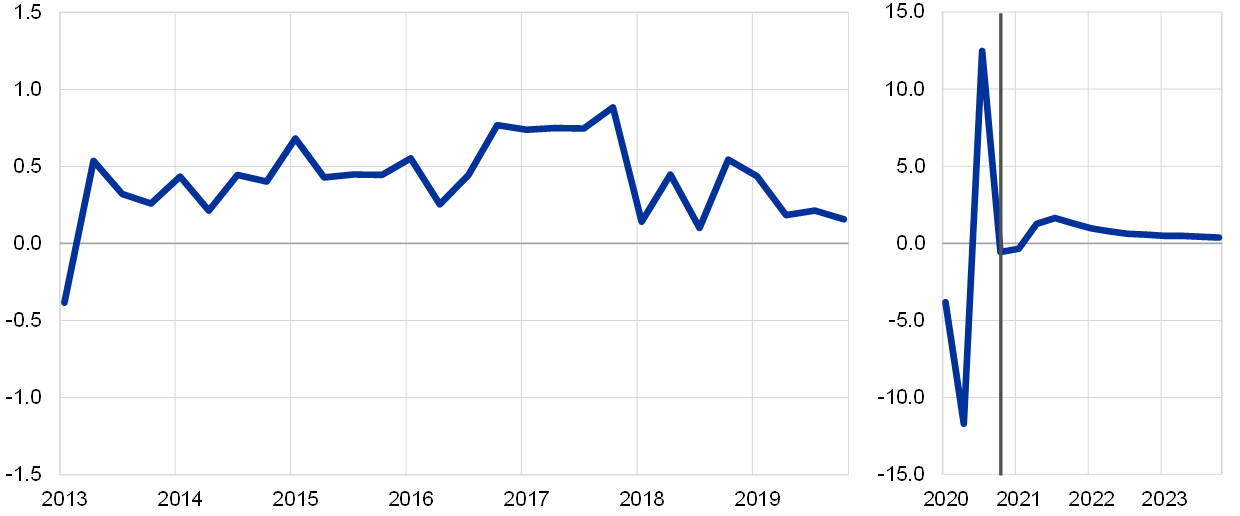 Following a modest contraction in output in the fourth quarter of 2020, economic activity in the euro area is expected to remain weak in the first quarter of 2021. Real GDP declined by 0.7% quarter on quarter in the fourth quarter of 2020, following growth of 12.5% in the third quarter (Chart 10). That was, however, better than the 2.2% contraction that had been foreseen in the December 2020 Eurosystem staff macroeconomic projections. The fall in output in the fourth quarter was mainly due to domestic demand, particularly private consumption. Although output in the fourth quarter was still almost 5% below the pre-pandemic level seen a year earlier, the better than expected outcome for that quarter resulted in a positive carry-over effect on growth in 2021 totalling 2.2%. On the production side, developments in the fourth quarter varied significantly across sectors. While value added in the service sector declined markedly, output in the industrial sector (excluding construction) increased further. Indeed, with strong growth having already been seen in the third quarter, the rebound in industrial output in the second half of 2020 broadly offset the sharp decline seen in the first half of the year. Box 4 takes stock of the impact of pandemic-related containment measures across economic sectors in the largest euro area countries, as well as looking at how that impact has changed over time. Overall, euro area output is estimated to have fallen by 6.6% in 2020 – somewhat more than in the United States. As Box 1 explains, this may be related to the stricter lockdowns seen in the euro area and the more expansionary fiscal policy in the United States.
