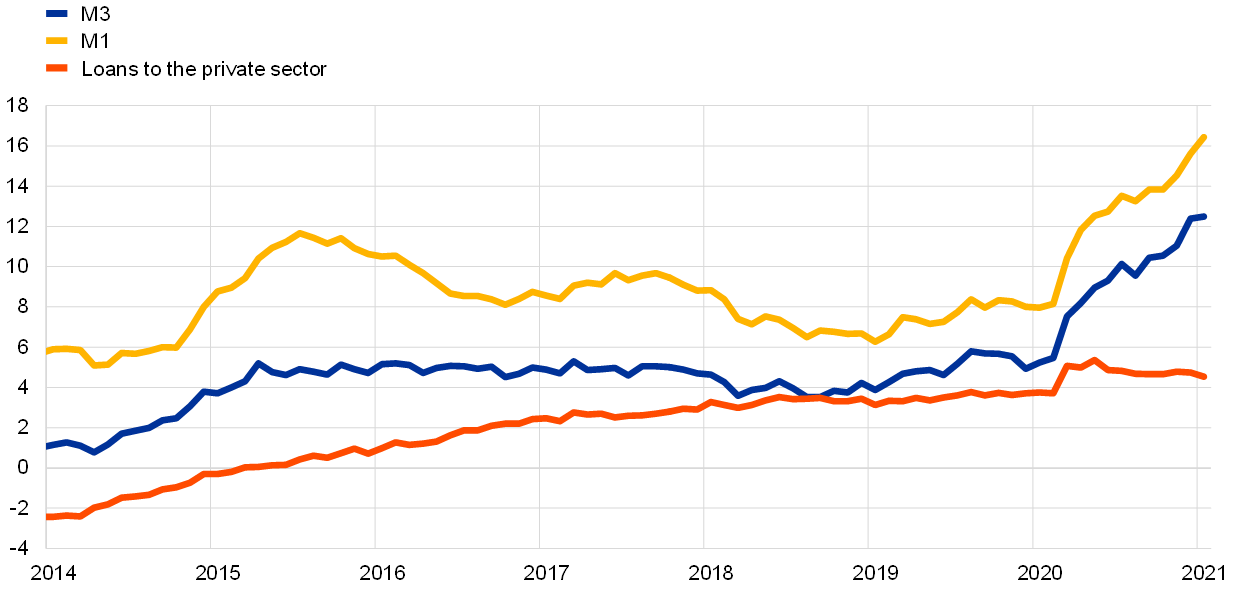 Monetary dynamics in the euro area continued to reflect the impact of the coronavirus pandemic. Broad money (M3) growth stood at 12.5% in January 2021, after 12.4% in December and 11.0% in November 2020. Strong money growth continued to be supported by the ongoing asset purchases by the Eurosystem, which remain the largest source of money creation. In the context of a still heightened preference for liquidity and a low opportunity cost of holding the most liquid forms of money, the narrow monetary aggregate M1 continues to be the main contributor to broad money growth. Developments in loans to the private sector were characterised by somewhat weaker lending to non-financial corporations and resilient lending to households. The monthly lending flow to non-financial corporations continued the moderation observed since the end of the summer. At the same time, the annual growth rate of loans to non-financial corporations remained broadly unchanged, at 7.0%, after 7.1% in December, still reflecting the very strong increase in lending in the first half of the year. The annual growth rate of loans to households remained broadly stable at 3.0% in January, after 3.1% in December, amid a solid positive monthly flow. Overall, the Governing Council’s policy measures, together with the measures adopted by national governments and other European institutions, remain essential to support bank lending conditions and access to financing, in particular for those most affected by the pandemic.