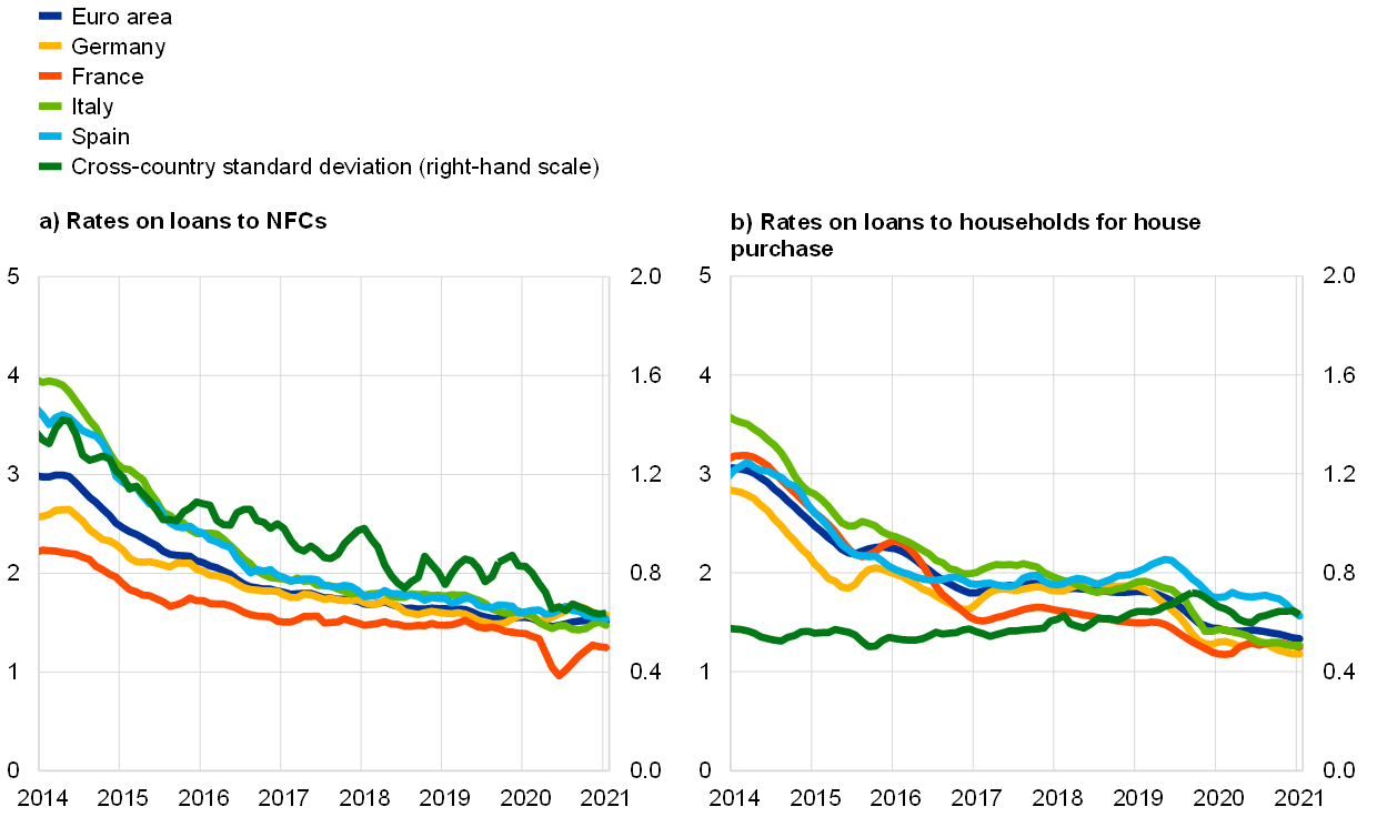 Notes: The indicator for the total cost of bank borrowing is calculated by aggregating short and long-term rates using a 24-month moving average of new business volumes. The cross-country standard deviation is calculated using a fixed sample of 12 euro area countries. The latest observations are for January 2021.