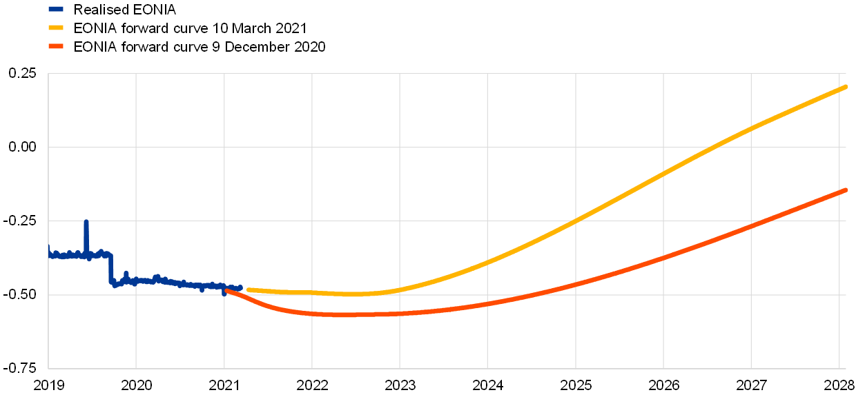 Financial conditions in the euro area have tightened somewhat since the Governing Council’s meeting in December 2020, amid positive risk sentiment. Over the review period (10 December 2020 to 10 March 2021) the forward curve of the euro overnight index average (EONIA) shifted upwards and became steeper. Currently, the forward curve does not signal expectations of a rate cut in the very near term. Euro area long-term sovereign bond spreads remained stable, as the rise in yields was driven by the increase in risk-free rates, supported by robust risk sentiment underpinned by monetary and fiscal stimulus. The prices of risk assets increased accordingly. In foreign exchange markets, the nominal effective exchange rate of the euro weakened slightly.