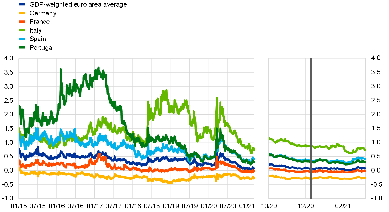 Notes: The spread is calculated by subtracting the ten-year overnight index swap rate from the ten-year sovereign bond yield. The vertical grey line denotes the start of the review period on 10 December 2020. The latest observations are for 10 March 2021.