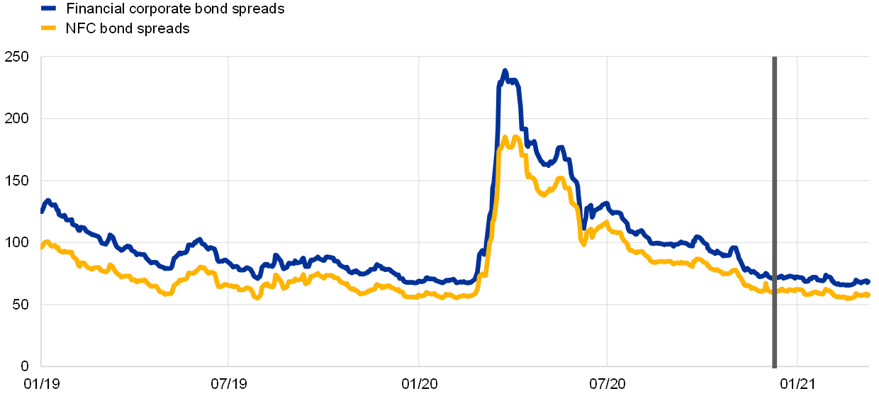 Euro area corporate bond spreads remained broadly unchanged (Chart 8). Over the review period, the investment-grade NFC bond spread and financial sector bond spread (relative to the risk-free rate) narrowed by 2 and 4 basis points, respectively, to stand in line with their pre-pandemic levels. Overall, there have been only minor movements in corporate bond spreads since the December meeting of the Governing Council.