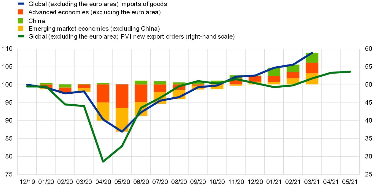 Note: The latest observations are for May 2021 for the PMI data and March 2021 for global merchandise imports.