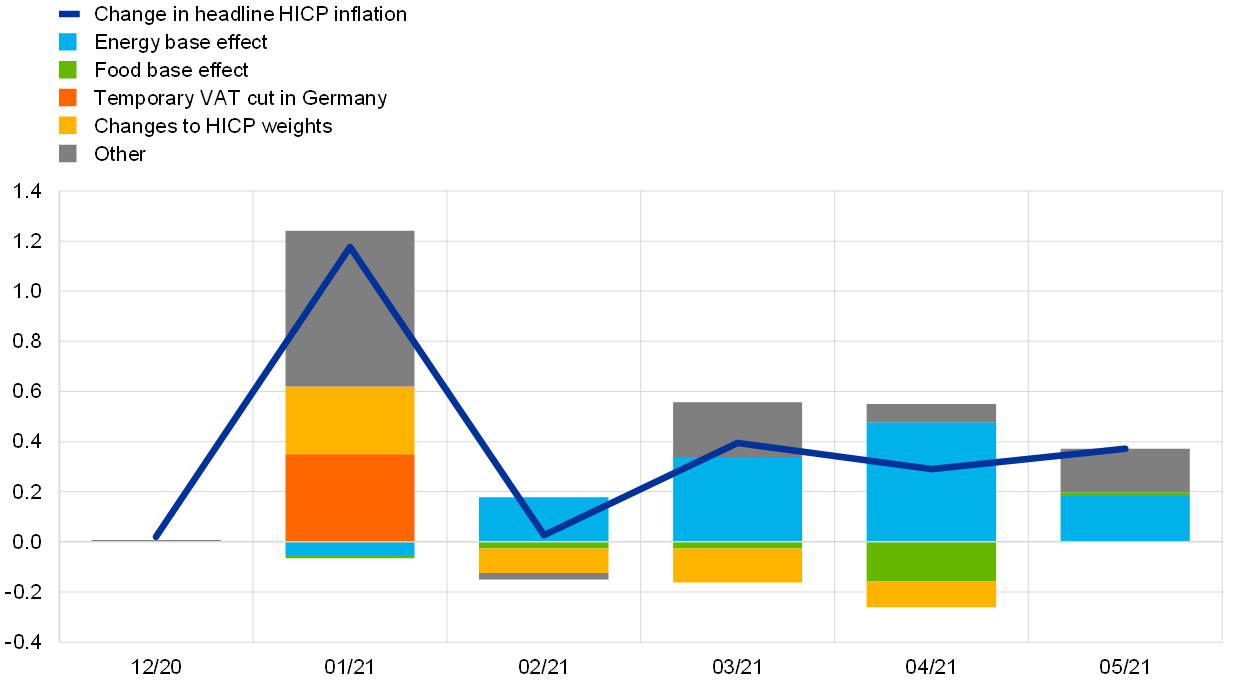 7. The coronavirus (COVID-19) pandemic triggered significant changes in household spending in 2020. Those shifts are reflected in the 2021 HICP weights – and, therefore, the resulting annual inflation figures. For analysis of the complexity of this impact, see the box entitled “2021 HICP weights and their implications for the measurement of inflation”, Economic Bulletin, Issue 2, ECB, 2021.