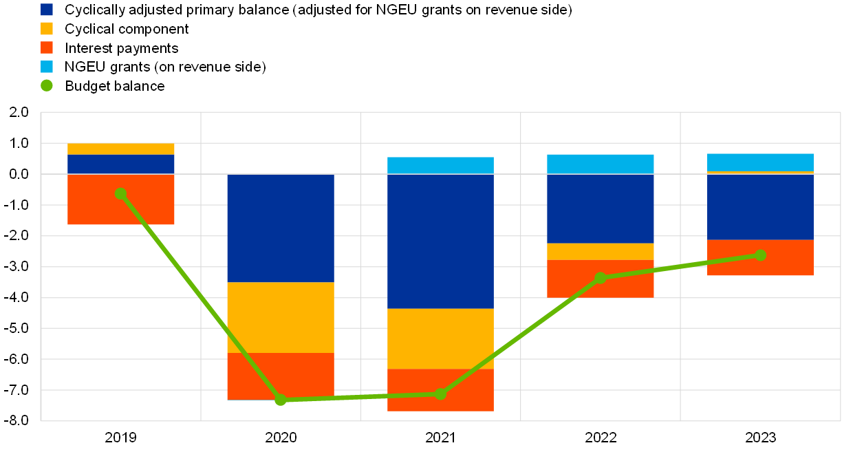 14. The fiscal stance is assessed at -4.2 percentage points of GDP in 2020 and is projected to be -1, +2.1 and +0.1 percentage points of GDP in 2021, 2022 and 2023, respectively, after adjustment for revenues related to NGEU grants.