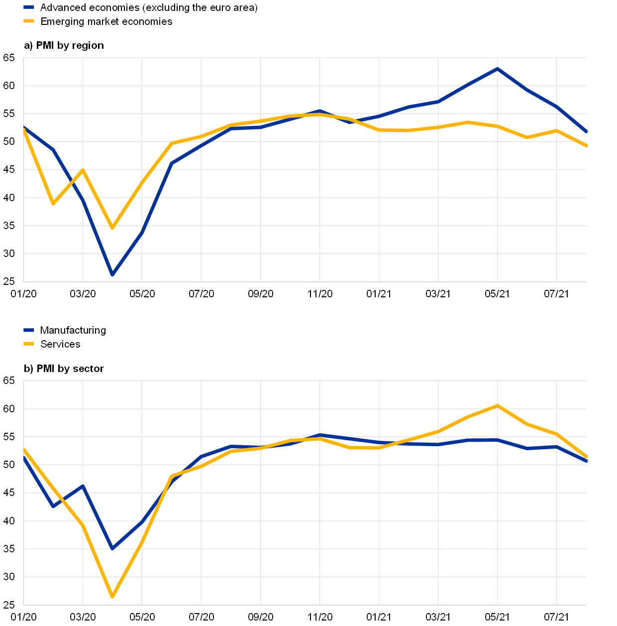 Survey indicators suggest a moderation in the pace of the recovery in global economic activity, particularly among emerging market economies, amid persisting supply bottlenecks. In August the global composite output Purchasing Managers’ Index (PMI) decreased for the third consecutive month, falling to 51.3 from 54.9 in July. While the index remains in expansionary territory, it shows some easing in growth compared with the second quarter. The composite output PMI declined for both advanced and emerging market economies, and for the latter it fell below the expansionary threshold for the first time since June 2020 (to 49.3 from 52.0 in July). Across components, the services output PMI dropped sharply from its peak of 60.5 in May to 51.5, falling particularly for advanced economies. The manufacturing PMI also declined, falling below the expansionary threshold for emerging market economies although remaining slightly above that threshold overall (50.7, down from 53.2). While the global economy continues to face a two-track recovery, with advanced economies recovering at a faster speed than emerging market economies, the recent PMIs point to a narrowing in the divergence between the two regions, and also between sectors (Chart 1).