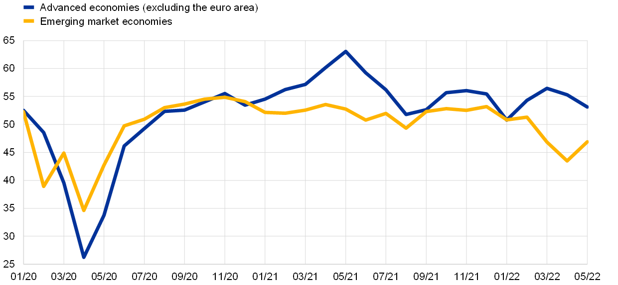 Survey indicators signal that global activity is moderating. The Purchasing Managers’ Index (PMI) surveys for May suggest that economic activity remained resilient across advanced economies in spite of the ongoing invasion, and that the services sector continued to outpace the manufacturing sector. In contrast, more muted economic activity in EMEs reflects developments in China and Russia (Chart 1). The global activity tracker, based on a broader range of indicators, confirms the trends shown in surveys. Overall, estimated global real GDP growth excluding the euro area slowed significantly to 0.5% in the first quarter of 2022, in line with the March 2022 ECB staff macroeconomic projections.