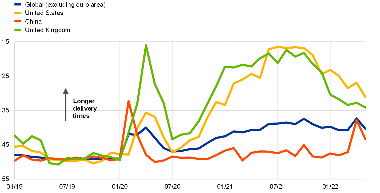 Disrupted economic activity in Asia and the war in Ukraine are putting pressure on global supply chains, following a brief period of easing earlier this year. The PMI suppliers’ delivery times had been improving throughout March, especially in the United States and United Kingdom (though the indicator was still pointing to long delivery times, remaining below the neutral threshold of 50). This positive trend was interrupted in April, when suppliers reported lengthening delivery times. In the case of the United States, however, a model-based analysis suggests that this development was a result of stronger demand rather than supply factors. At the same time, a marked lengthening of suppliers’ delivery times in China – largely on account of lockdown-related supply factors – has brought the global composite measure back to the levels recorded in late 2021 when supply bottlenecks were most acute. More recently suppliers’ delivery times have shortened again as the improving situation in China meant strict measures were eased in May. Delivery times in the United States and the United Kingdom have improved but are still far from normalisation (Chart 2).
