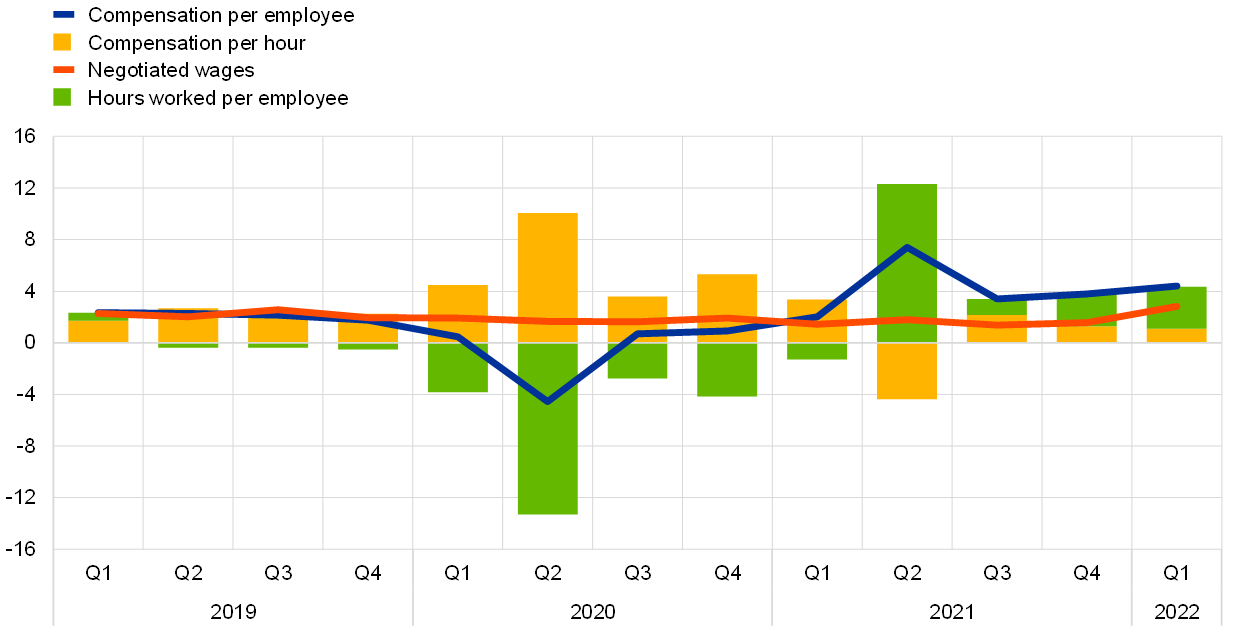 The labour market in the euro area continues to improve despite the economic impact of the war in Ukraine. The unemployment rate stood at 6.8% in April 2022, broadly unchanged since March and around 0.6 percentage points lower than the pre-pandemic level observed in February 2020 (Chart 6). This is also the lowest level recorded since the inception of the euro area, albeit with continuing, though progressively lower, recourse to job retention schemes in some countries. Total employment grew by 0.6% quarter on quarter in the first quarter of 2022, after standing at 0.4% in the fourth quarter of 2021. As a result of the economic recovery following the relaxation of pandemic-related containment measures, workers covered by job retention schemes accounted for 1.1% of the labour force in March 2022, down from around 1.6% in December 2021. Likewise, the available national accounts data indicate that in the first quarter of 2022, the total hours worked remained below pre-pandemic levels, particularly in the industrial and market services sectors.