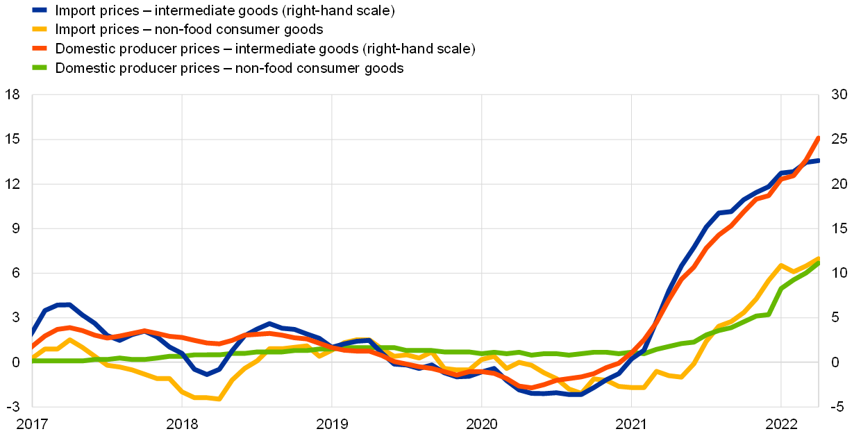 Increasing inflationary pressures are also evident from the rising export prices of the euro area’s competitors. Compared with the March 2022 ECB staff macroeconomic projections, euro area competitors’ export prices were revised significantly upwards for this year and the next, as higher oil and non-oil commodity prices interact with rising domestic and global pipeline pressures.