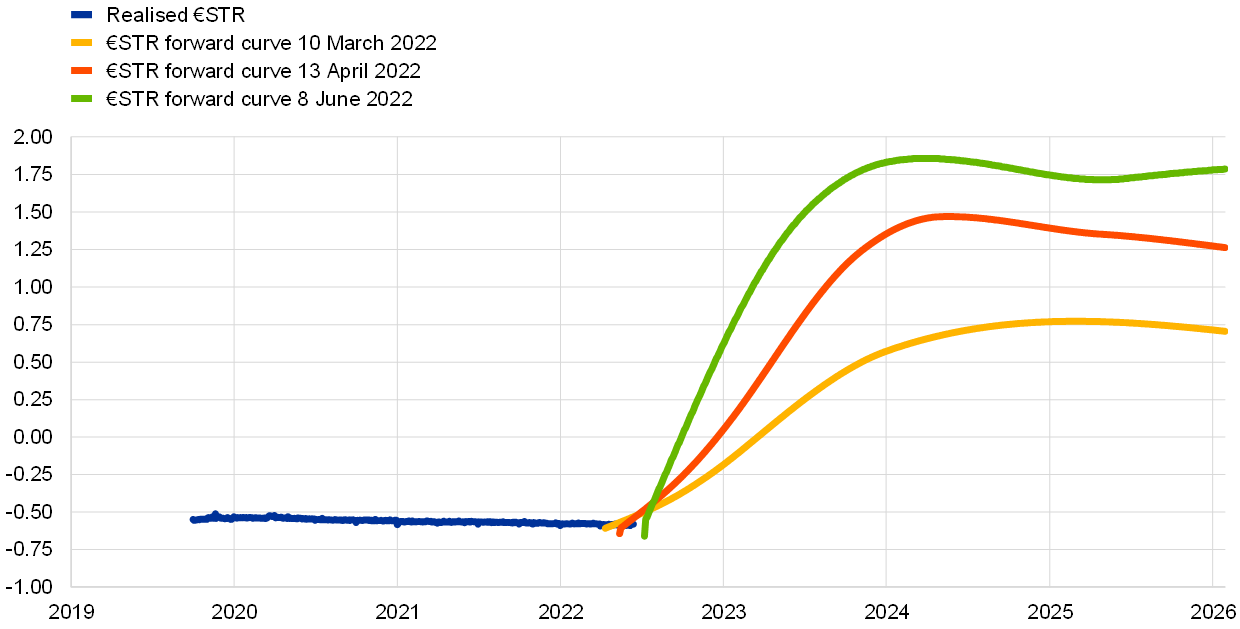 Market interest rates have increased in response to the changing outlook for inflation and monetary policy. With benchmark interest rates rising, bank funding costs have increased, and this has fed into higher bank lending rates, in particular for households. Nevertheless, lending to firms picked up in March. This was because of the continued need to finance investment and working capital against the backdrop of increasing production costs, persisting supply bottlenecks and lower reliance on market funding. Lending to households also increased, reflecting continued robust demand for mortgages.