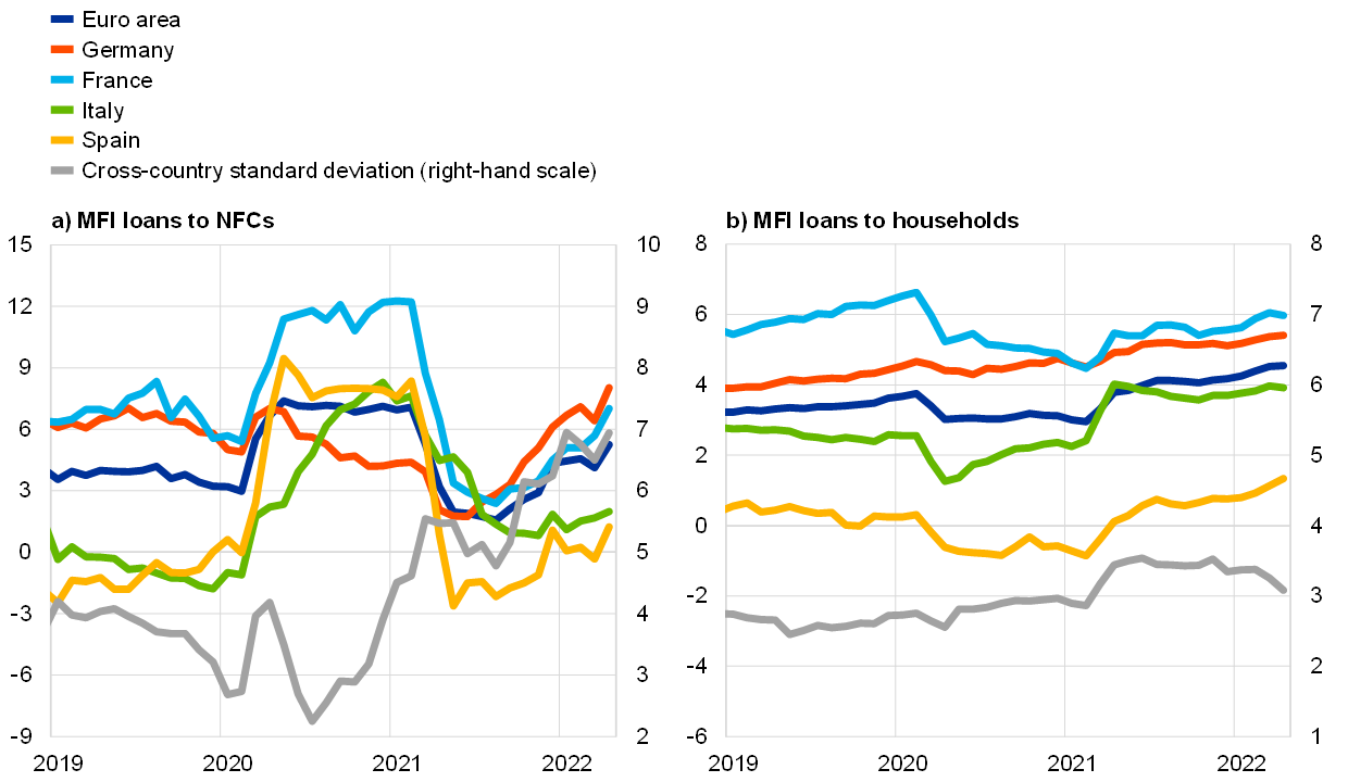 The pace of deposit accumulation by firms and households has decreased further from the high levels seen during the pandemic (Chart 26). In April the annual growth rate of overnight deposits continued to moderate, standing at 8.2%, down from 8.7% in March. The slowdown was observed for the overnight deposits of both firms and households, as higher costs for food and energy have reduced firms’ cash buffers and limited the capacity of households to accumulate savings. At the same time, higher uncertainty related to the economic impact of the war in Ukraine is still affecting deposit dynamics. As highlighted by the outbreak of the pandemic, firms and households respond to higher uncertainty with a change in their liquidity preferences, implying sizeable inflows into overnight deposits.[5] Growth in the deposit holdings of firms and households continues to vary across countries, reflecting differences in their liquidity needs and national fiscal support measures.