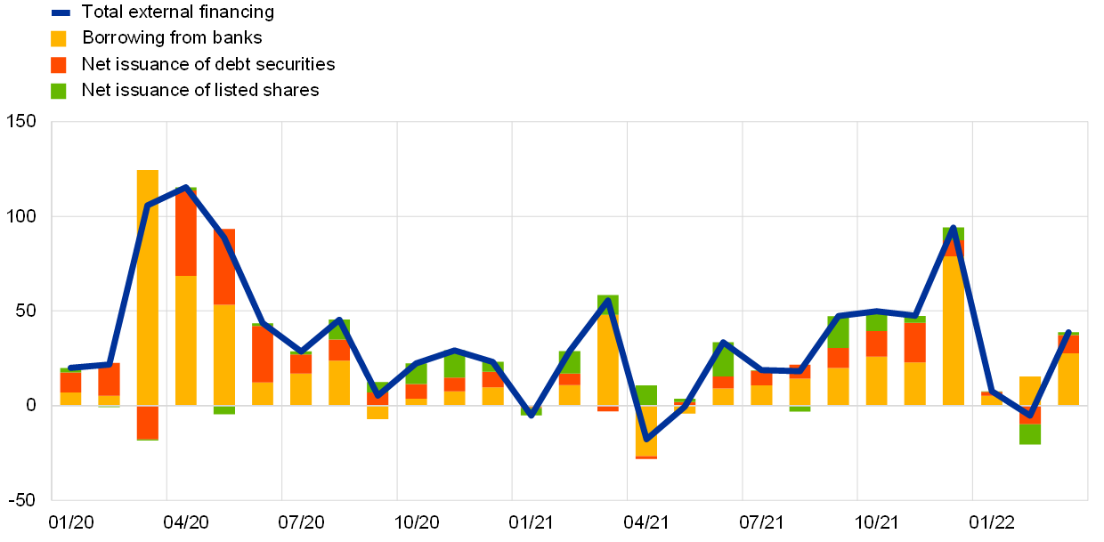 Notes: Net external financing is the sum of borrowing from banks (MFI loans), net issuance of debt securities and net issuance of listed shares. MFI loans are adjusted for loan sales, securitisation and cash-pooling activities. The latest observations are for March 2022.