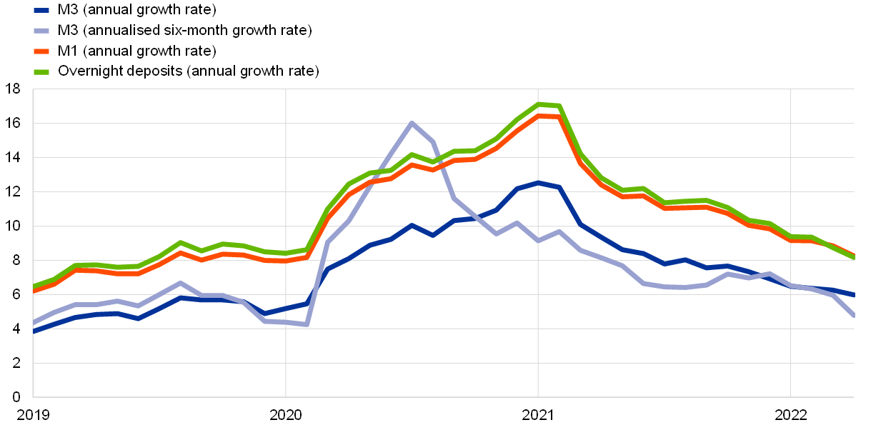 Broad money (M3) growth continued to move back towards its long-term average. In April the annual growth rate of M3 declined to 6.0%, down from 6.3% in March, thus bringing the (six-month annualised) growth rate below its long-term average for the first time since the outbreak of the pandemic (Chart 26). On the components side, the main driver of M3 growth continued to be the narrow aggregate M1, reflecting strong growth in overnight deposits. On the counterparts side, credit to the private sector continued to make the largest contribution to annual M3 growth, as the contributions of other components dwindled. The contribution of the Eurosystem’s net purchases of government securities under the asset purchase programme and the pandemic emergency purchase programme has been declining as purchases under these programmes are gradually being phased out. At the same time, money creation is being dampened by higher net monetary outflows to the rest of the world, largely reflecting the negative impact of higher energy prices on the euro area trade balance.
