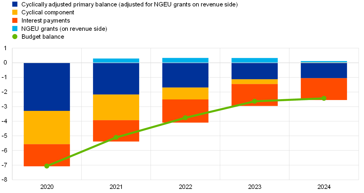 8. The fiscal stance reflects the direction and size of the stimulus from fiscal policies to the economy beyond the automatic reaction of public finances to the business cycle. It is measured here as the change in the cyclically adjusted primary balance ratio net of government support to the financial sector. Given that the higher budget revenues related to NGEU grants from the EU budget do not have a contractionary impact on demand, the cyclically adjusted primary balance is in this context adjusted to exclude those revenues. For more details on the concept of the euro area fiscal stance, see the article entitled “The euro area fiscal stance”, Economic Bulletin, Issue 4, ECB, 2016.