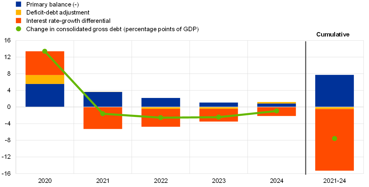 Following a large increase in 2020, the euro area government debt-to-GDP ratio fell slightly in 2021 and is expected to shrink slowly to just below 90% by 2024, well above its pre-crisis level. After the debt ratio increased by about 13 percentage points to 97% in 2020, a falling but still high primary deficit in 2021 is estimated to have been more than offset by a significant debt-reducing contribution from a favourable interest rate-growth differential. Throughout the period 2022-24, the debt ratio is projected to continue declining slowly but steadily as debt-increasing primary deficits are outweighed by still favourable contributions from interest rate-growth differentials and, to a limited extent in the first two years, from deficit-debt adjustments (Chart 28). At the end of the projection horizon in 2024, the debt-to-GDP ratio is expected to stabilise at just below 90%, i.e. 12 percentage points above its pre-crisis level in 2019.