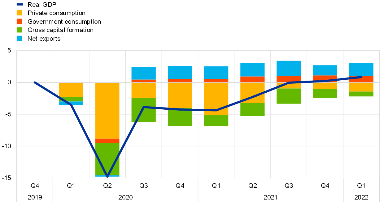 Euro area domestic demand contracted in the first quarter of 2022. While GDP increased by 0.6% quarter on quarter in the first quarter of the year, the contribution from domestic demand stood at -0.4 percentage points, signalling an overall weakness in domestic sources of growth. By contrast, net trade and changes in inventories made a positive contribution to growth. GDP growth was 0.3 percentage points higher than Eurostat’s flash estimate, reflecting the inclusion of volatile data from Ireland, which showed double-digit growth in the first quarter owing to developments in its multinational sector, thereby boosting its net trade contribution to growth. The level of GDP in the euro area stands 0.8% above its pre-pandemic level observed in the final quarter of 2019 (Chart 4). On the production side, total value added displayed a broadly based increase across the main sectors of the economy.