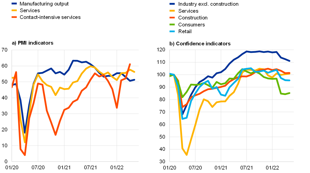 Notes: “Contact-intensive services” refers to accommodation, food and beverage service activities. The latest observations are for May 2022, except for contact-intensive services for which the latest observation is for April 2022.