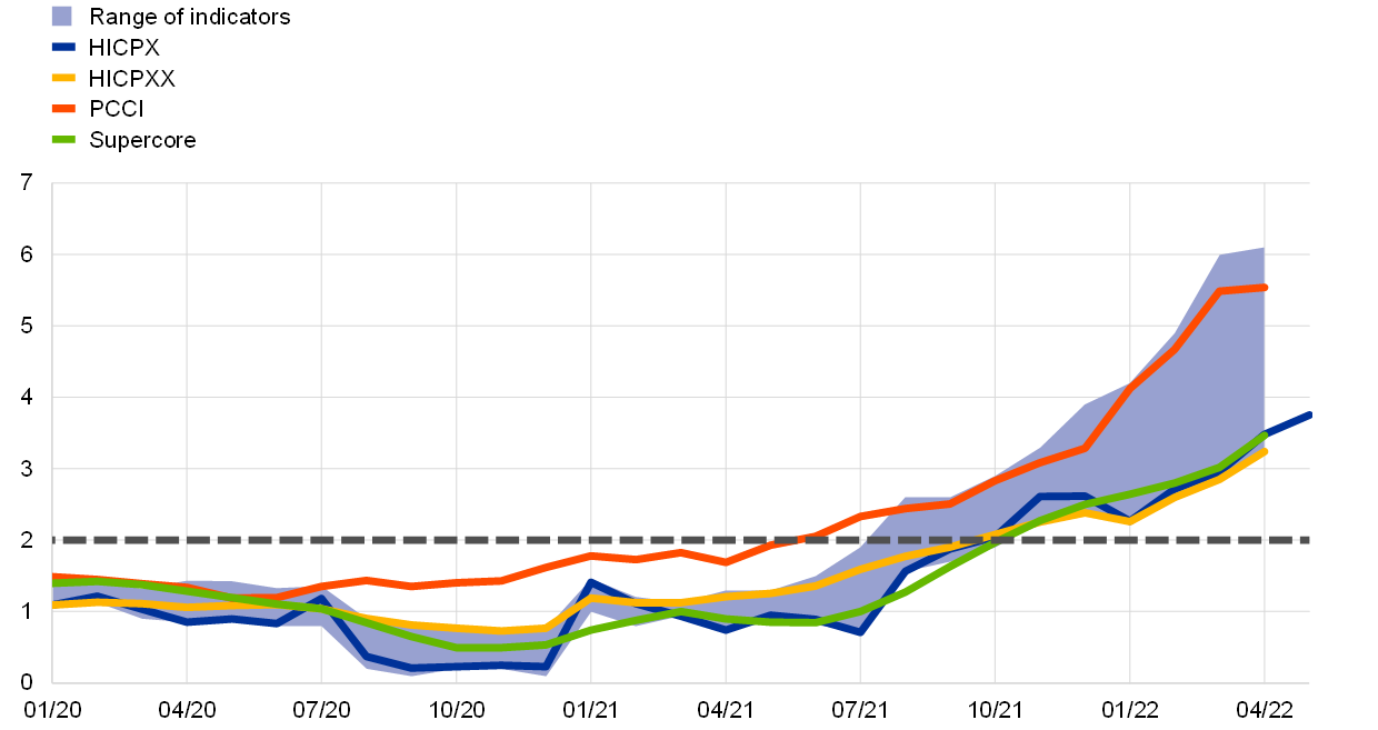 In this box, we present a new measure of domestic inflation for the euro area that takes into account the import intensity of HICP items. For this new indicator, the import intensities of HICP items are derived using information from national accounts and input-output tables. The HICP items with a relatively low import intensity are subsequently aggregated to what is referred to as a “Low IMport Intensity” (LIMI) inflation indicator.[22] The threshold for the import intensities, below which an HICP item is included in the indicator, is determined on the basis of empirical criteria. While the ECB’s inflation target is formulated in terms of headline inflation, the concept of domestic inflation is of analytical relevance to monetary policy, as it features prominently in the monetary policy transmission mechanism.[23] The GDP deflator is a commonly used indicator of domestic inflation, but while it discounts for imported inflation it captures price developments beyond consumer prices, such as prices for investment goods or exports that may not be very closely linked to domestically-driven consumer price inflation. In addition, standard exclusion-based indicators of core inflation may still include items that may have a high import intensity. The newly developed LIMI inflation indicator can complement some of these other indicators. It suggests that, although the sharp rise in headline inflation is mainly explained by imported inflation, domestic inflationary pressures have also increased over the past year.[24]