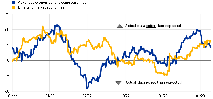 Global economic activity surprised to the upside at the start of the year. Incoming data for both emerging and advanced economies were stronger than expected, driven largely by the economic reopening in China (Chart 1). The global composite output Purchasing Managers’ Index (PMI) increased further in March and reached 51.8 for the first quarter, up from 48.4 in the previous quarter. PMI data signal a growing divergence between services, which stood at an eight-month high in March, and manufacturing, which weakened further into contractionary territory in some major advanced economies.