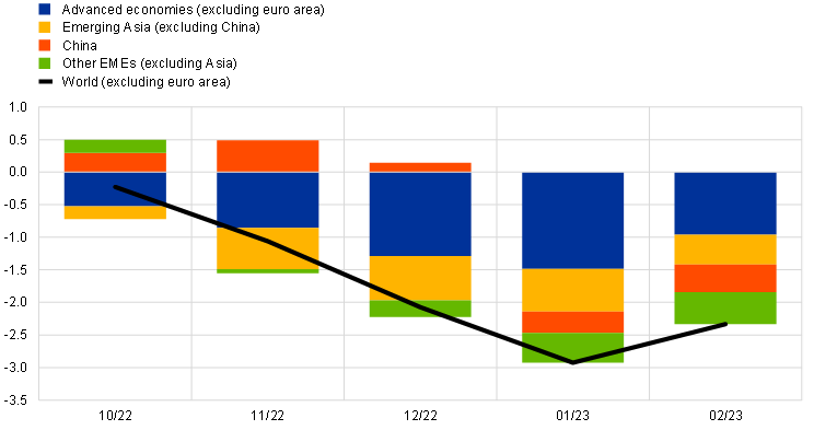 Global economic activity was stronger than expected in early 2023. The global economy was supported by China’s economic reopening after the end of its zero-COVID policy, along with resilience in the US labour market – significant monetary policy tightening notwithstanding. Trade, however, remained relatively weak as the recovery in activity was concentrated in less trade-intensive demand components, such as services. Global headline inflation continues to recede, while core inflation remains at elevated levels.