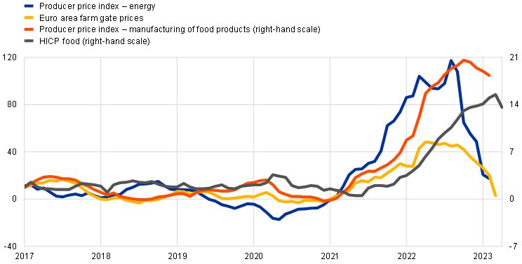 Oil prices remained broadly unchanged (+1%) since the March Governing Council meeting, as the oil price increase in reaction to the OPEC+ supply cut was counterbalanced by concerns about demand amid the recent US banking sector stress. Oil prices increased by 9% immediately after OPEC+ announced plans to reduce oil production by close to 1.7 million barrels per day (Chart 4). OPEC+ communicated an intention to act pre-emptively to stabilise oil markets in anticipation of weaker global oil demand. However, the gains in oil prices following the OPEC+ announcement were broadly reversed as oil prices continued to be affected by downside risks to US demand amid recent stress in the banking sector. However, if such downside risks do not materialise, it is worth noting that the production cut will take place in the second half of 2023, when an oil supply deficit is expected by the International Energy Agency. European gas prices fell 13% to below 40 EUR/MWh, while the EU enters the gas storage replenishment season at record-high storage levels. With the prolongation of EU gas saving measures – which envisage Member States reducing gas consumption by 15% between 1 April 2023 and 31 March 2024 – the EU is on track to achieve its 90% storage target for November 2023. Non-energy commodity prices have remained broadly unchanged since the March Governing Council meeting. International food commodity prices continued to be affected by severe droughts in Argentina and the announcements of temporary bans imposed by Poland, Hungary and Slovakia on Ukrainian grain imports, which counterbalanced the effects of the extension of the Black Sea Grain Initiative on grain prices. Meanwhile, metal prices were supported by higher Chinese demand following the recent reopening of the Chinese economy, but were weighed down by concerns over global demand amid stress in the banking sector.