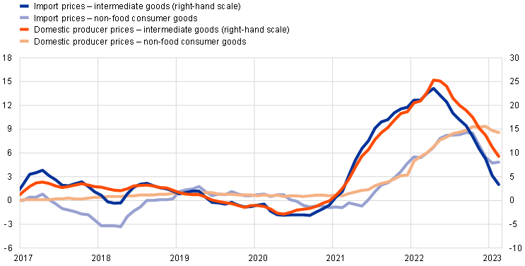 12. See the boxes entitled “Industrial producer prices for sales in domestic and non-domestic markets”, Monthly Bulletin, ECB, April 2013; and “What can recent developments in producer prices tell us about pipeline pressures?”, Economic Bulletin, Issue 3, ECB, 2017.