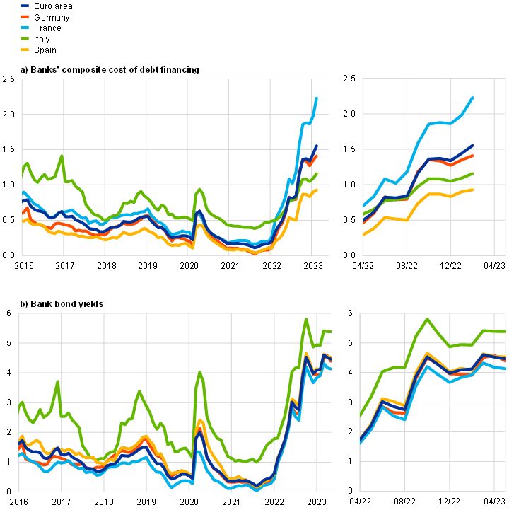 Notes: Composite bank funding rates are a weighted average of the composite cost of deposits and unsecured market-based debt financing. The composite cost of deposits is calculated as an average of new business rates on overnight deposits, deposits with an agreed maturity and deposits redeemable at notice, weighted by their respective outstanding amounts. Bank bond yields are monthly averages for senior-tranche bonds. The latest observations are for February 2023 for composite bank funding rates and 3 May 2023 for bank bond yields.