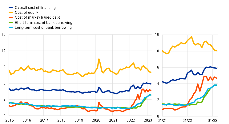 Notes: The overall cost of financing for NFCs is calculated as a weighted average of the cost of borrowing from banks, market-based debt and equity, based on their respective outstanding amounts. The latest observations are for 3 May 2023 for the cost of market-based debt (monthly average of daily data), 28 April 2023 for the cost of equity (weekly data) and 28 February 2023 for the overall cost of financing and the cost of borrowing from banks (monthly data).