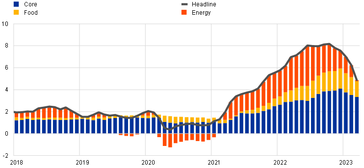 In the United States, economic activity is moderating, reflecting weak domestic demand. GDP growth for the first quarter of 2023 was 0.3% (quarter on quarter), half that of the previous quarter, mainly reflecting a decline in private inventories and a weakening in non-residential investment. Private consumption regained momentum, reflecting a one-off reduction in taxes in January, while it remained subdued for the rest of the quarter. The failure of Silicon Valley Bank (SVB) triggered severe but short-lived stress in the banking sector, which led to a tightening of lending conditions that may weigh on consumer spending. Meanwhile, the labour market remains resilient despite the monetary policy tightening. Nominal wage growth is easing but remains high, signalling ongoing tightness in the labour market. Annual headline inflation declined to 5.0% in March from 6.0% in February, primarily owing to base effects in energy prices related to the spike in energy prices following Russia’s invasion of Ukraine in 2022. However, underlying inflationary pressures remain high, with core inflation increasing marginally to 5.6% in March due to high service price inflation.