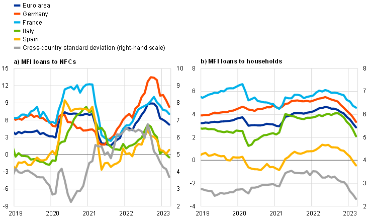 Notes: Loans from monetary financial institutions (MFIs) are adjusted for loan sales and securitisation; in the case of NFCs, loans are also adjusted for notional cash pooling. The cross-country standard deviation is calculated using a fixed sample of 12 euro area countries. The latest observations are for March 2023.