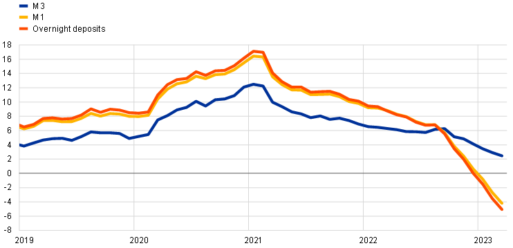 Overnight deposits contracted strongly in March, driven by the reallocation of funds to instruments with a higher remuneration, in particular time deposits but also non-bank financial instruments. The annual growth rate of overnight deposits declined to -5.1% in March, from -3.5% in February. The sharp decline in the growth of overnight deposits and therefore also in the narrow monetary aggregate M1 is the strongest contraction observed since the start of the Economic and Monetary Union in 1999 (Chart 23). After recording its first negative annual growth rate in January (-0.8%), M1 growth has continued to weaken, declining from -2.7% in February to -4.2% in March. This is especially owing to the large-scale substitution of overnight deposits with time deposits, but it also reflects the shift to bank bonds and, to a lesser extent, money market fund shares. The absence of a material increase in currency in circulation suggests that there was no widespread decrease in the public’s trust in euro area banks following the March turmoil. This pattern of portfolio rebalancing was also observed in previous tightening cycles, as the remuneration of overnight deposits adjusts sluggishly to policy rate changes. The remuneration of time deposits and market-based instruments, however, adjusts faster, leading to a widening of interest rate spreads, which in turn creates incentives for portfolio reallocation. The strong shift away from overnight deposits in the current tightening cycle can be explained by the following main factors. First, the pace of the ECB’s policy tightening is faster than in previous tightening cycles, leading to a sharp widening of the spread between overnight and time deposits. Second, the accumulated share of overnight deposits was exceptionally large after the period of low interest rates and the COVID-19 pandemic. Third, the sharp weakening of lending dynamics dampens overall money creation.