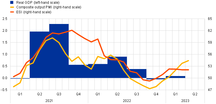 Notes: The two lines indicate monthly developments; the bars show quarterly data. The European Commission’s Economic Sentiment Indicator (ESI) has been standardised and rescaled to have the same mean and standard deviation as the composite output Purchasing Managers’ Index (PMI). The latest observations are for the first quarter of 2023 for real GDP and April 2023 for the ESI and the composite output PMI.