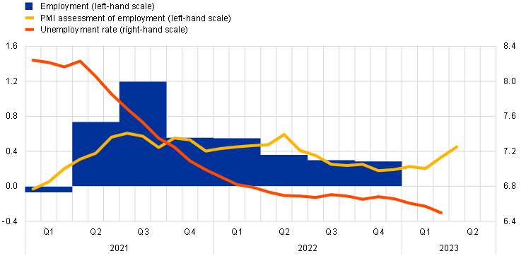 Notes: The two lines indicate monthly developments; the bars show quarterly data. The PMI is expressed as the deviation from 50 divided by 10. The latest observations are for the fourth quarter of 2022 for employment, April 2023 for the PMI assessment of employment and March 2023 for the unemployment rate.