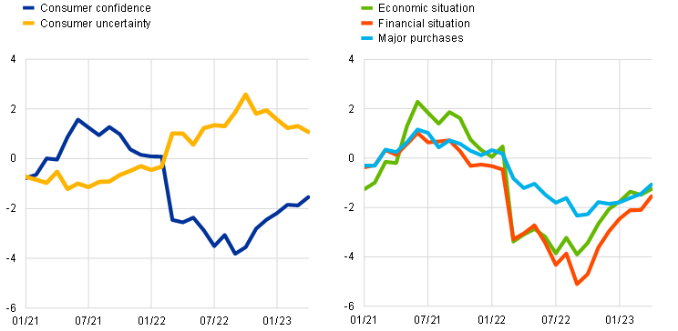 Private consumption growth is likely to have been subdued in the first quarter of 2023. The negative dynamics of household consumption in the fourth quarter of 2022 were driven mainly by weak consumption of goods, while consumption of services remained broadly resilient, benefiting from lingering reopening effects. This dichotomy is likely to have continued in the first quarter of 2023. Elevated inflation continues to weigh on disposable income, while persistent uncertainty is dampening consumer spending. Retail sales figures in January and February suggest that spending on goods in the first quarter is likely to have contracted further. New passenger car registrations declined in the first quarter, largely on account of the withdrawal of purchase incentives for electric vehicles in Germany. By contrast, consumption of services is likely to have been more resilient in the first quarter, as suggested by the PMI for contact-intensive services, which remained solidly in expansionary territory. The European Commission’s consumer confidence indicator continued its recovery in the first quarter of 2023 (Chart 8, left-hand panel), albeit from low levels, driven by an improvement in household expectations (Chart 8, right-hand panel). Incoming economic data point to improving, but still subdued, consumer spending. Consumer confidence improved further in April, but remained at low levels. While expectations for retail trade business activity deteriorated slightly, expected demand for accommodation, food and travel services remained resiliently above its historical average, and expectations for consumer goods production recovered further. The ECB’s Consumer Expectations Survey corroborates these findings, pointing to a low level of expected “big item” purchases but a rise in holiday bookings.