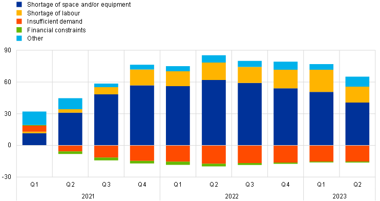 Business investment is expected to have grown again in early 2023 following a contraction in the fourth quarter of 2022. Quarter-on-quarter headline non-construction investment fell by 5.8% in the fourth quarter of 2022. Excluding the strongly negative contribution from investment in intellectual property products in Ireland, it would have declined by 0.3% quarter on quarter.[3] Production up to February 2023 grew by 1.2% from the previous quarter and PMI output rose in the capital goods sector against a backdrop of easing supply disruptions and lower energy costs.[4] Meanwhile, the relative importance of internal corporate financing is increasing as the cost of borrowing rises and credit standards tighten. European Commission survey data show that, while remaining above historical averages, perceived limits to production in the capital goods sector diminished in the second quarter of 2023 compared with the previous quarter, as a result of the lower impact from factors related to space and/or equipment, as well as labour (Chart 9).