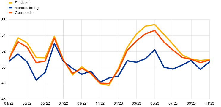 In 2023 global economic growth was moderate but steady amid strong private consumption and resilient labour markets. Global economic activity has been underpinned by emerging market economies including China, and, among advanced economies, by the United States.[2] Solid domestic demand and a strong labour market in the United States resulted in robust growth despite significant monetary policy tightening. In China, the lifting of coronavirus (COVID-19) restrictions at the start of the year and a broader recovery in private consumption compensated for weakness in the residential sector. Most recent data provide mixed signals across large economies. While real GDP growth strengthened in both China and the United States in the third quarter, it remained flat in the United Kingdom and contracted in Japan as a result of high inflation weighing on activity and consumption in both. Global real GDP is expected to decelerate slightly in the fourth quarter as previous tailwinds dissipate, which is in line with the latest global composite output Purchasing Managers’ Index (PMI). After declining for six consecutive months, the composite PMI broadly stabilised in November and remains in expansionary territory. Across sectors, PMI data suggest that manufacturing activity remains subdued, with the index still hovering around the neutral threshold. At the same time, post-COVID-19 growth momentum seems to be waning for services, with the related PMI declining steadily during the second half of the year before stabilising slightly above the neutral threshold in November (Chart 1).