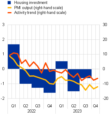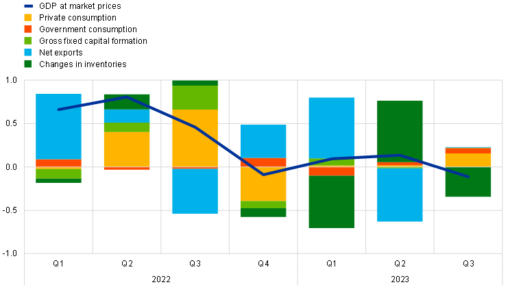 The euro area economy contracted slightly in the third quarter of 2023, mostly owing to a decline in inventories. Tighter financing conditions and subdued foreign demand are likely to continue weighing on economic activity in the near term. Prospects are especially weak for construction and manufacturing, the two sectors most affected by higher interest rates. Services activity is also set to soften in the coming months. This is due to spillovers from weaker industrial activity, fading effects from the reopening of the economy and the broadening impact of tighter financing conditions.