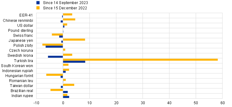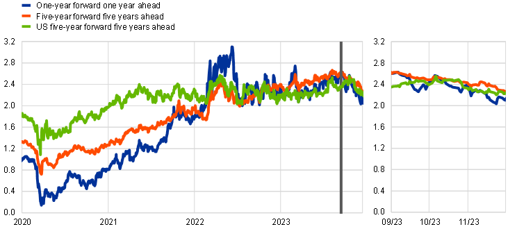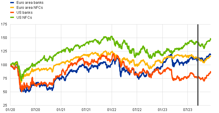 Compared with the September 2023 projections, global financial conditions fluctuated but ultimately eased slightly across advanced economies. At the start of the review period (from 14 September to 13 December 2023), they tightened considerably across advanced economies as long-term sovereign bond yields were driven up, mainly as a result of higher risk compensation owing to greater uncertainty about future short-term interest rates. However, this tightening was more than reversed after inflation came in slightly below expectations in several jurisdictions, while some central banks also softened their communication on whether additional interest rate increases would be necessary. In the United States, market expectations that inflation would soften further amid resilient but slowing growth fostered a downward shift in monetary policy expectations and supported risk sentiment. In general, the price of riskier assets moved in tandem with interest rate fluctuations to end the period slightly higher.
