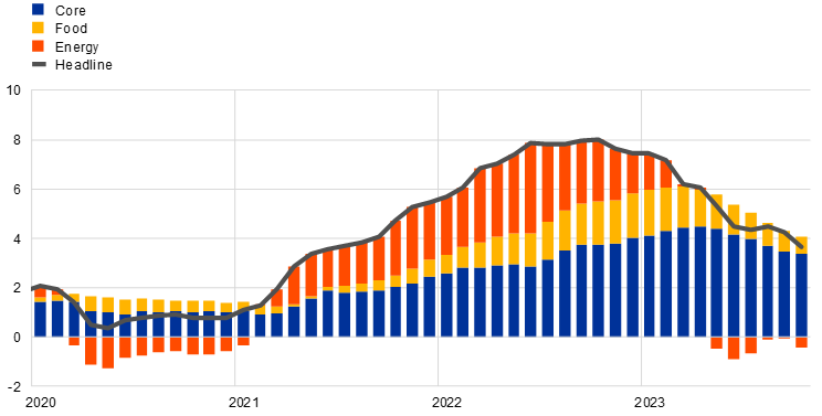Inflation excluding energy and food dropped by almost a full percentage point over October and November 2023, falling to 3.6% in November. This reflects improving supply conditions, the fading effects of the past energy shock and the impact of tighter monetary policy on demand and on the pricing power of firms. The inflation rates for goods and services fell to 2.9% and 4.0% respectively.