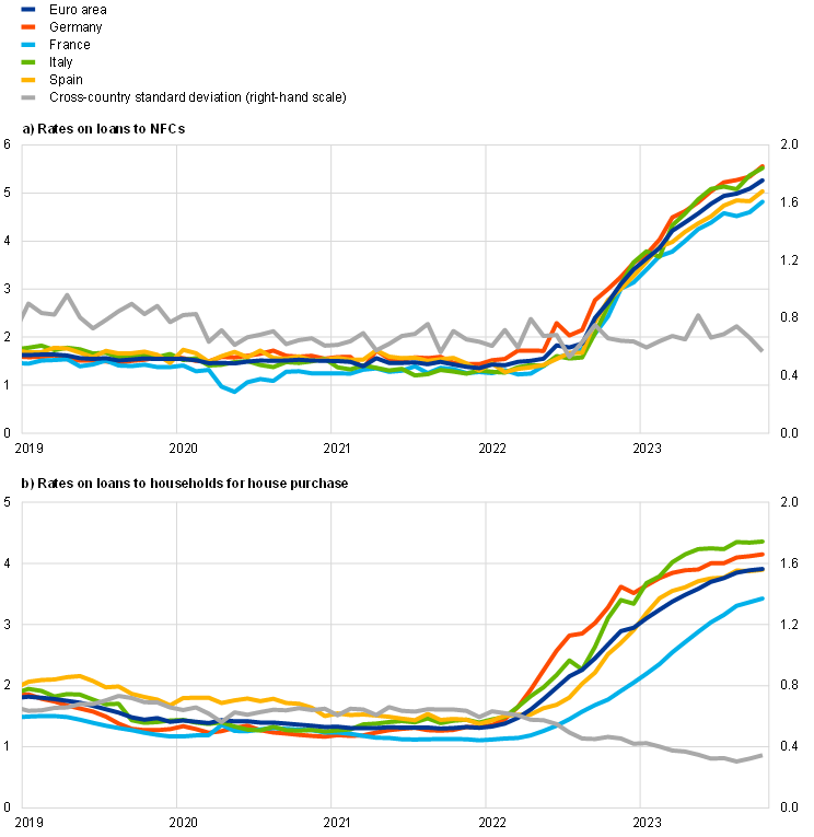 Notes: Loans from monetary financial institutions (MFIs) are adjusted for loan sales and securitisation; in the case of non-financial corporations (NFCs), loans are also adjusted for notional cash pooling. The cross-country standard deviation is calculated using a fixed sample of 12 euro area countries. The latest observations are for October 2023.