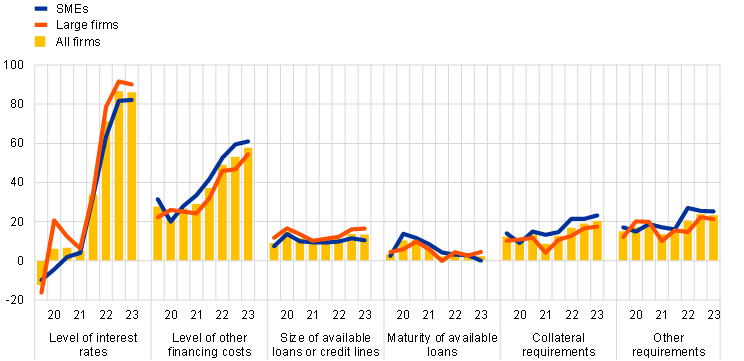 Notes: SMEs stands for small and medium-sized enterprises. The figures are based on firms that had applied for bank loans (including subsidised bank loans), credit lines, or bank or credit card overdrafts. Net percentages are the difference between the percentage of firms reporting an increase for a given factor and the percentage reporting a decrease. The figures refer to rounds 22-29 of the survey (October 2019-March 2020 to April 2023-September 2023).