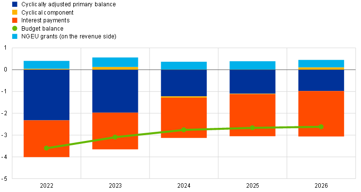 Notes: The cyclically adjusted primary balance is adjusted for Next Generation EU (NGEU) grants on the revenue side. The data refer to the aggregate general government sector of all 20 euro area countries (including Croatia).